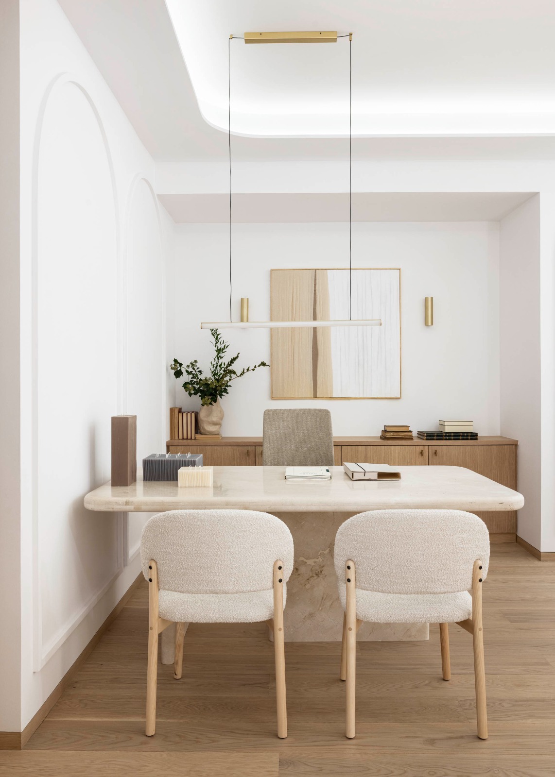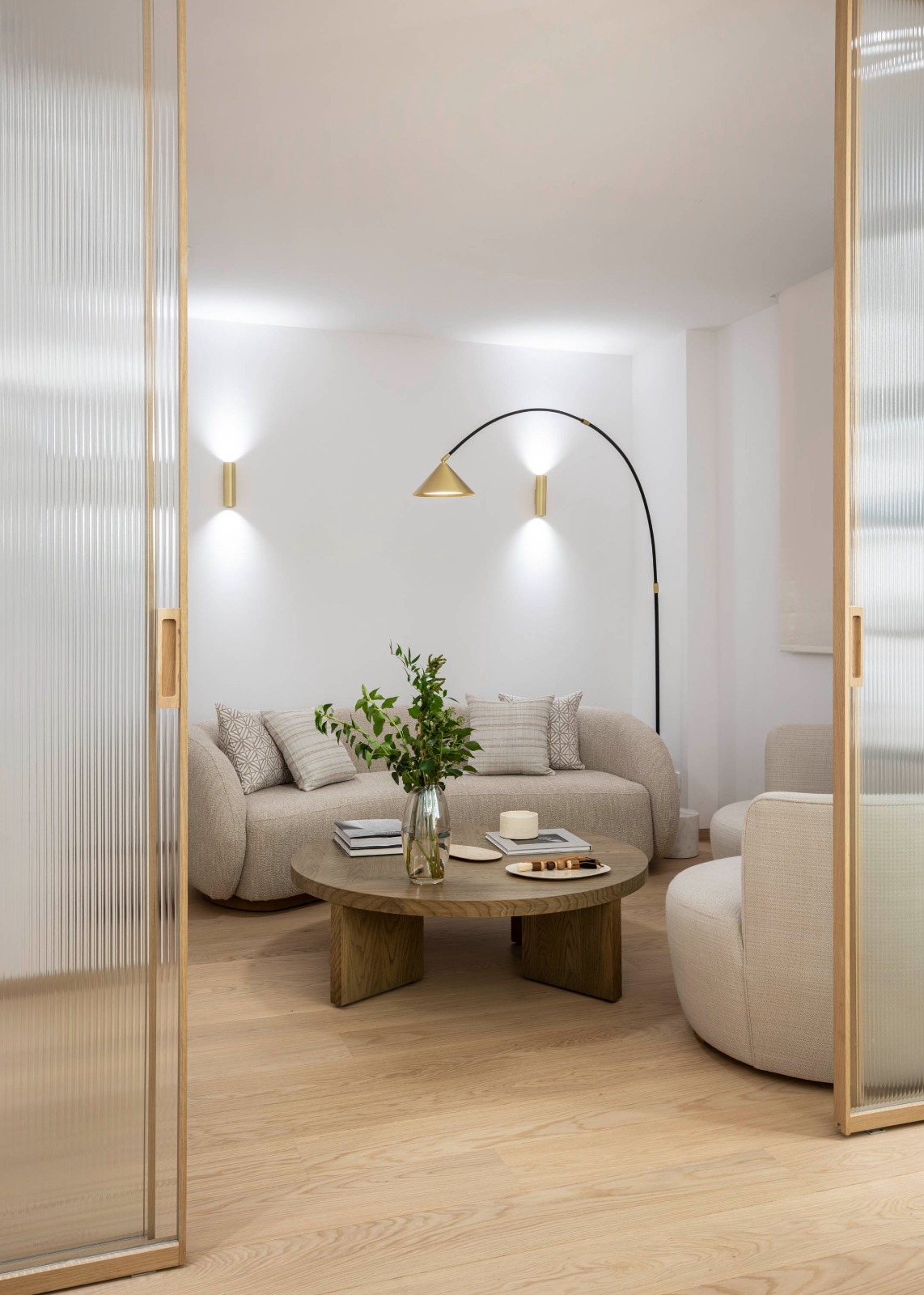El proyecto está guiado por líneas curvas que suavizan recorridos y articulan cada estancia con un lenguaje amable. La iluminación, cálida e indirecta, se integra con precisión para potenciar volúmenes y texturas. Todo el espacio fluye, invitando a bajar el ritmo desde el primer paso.