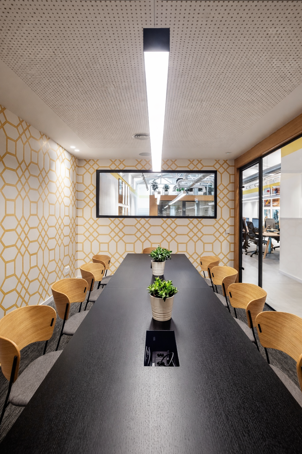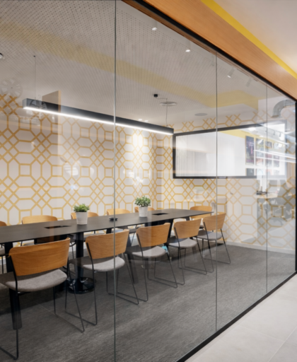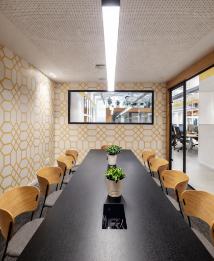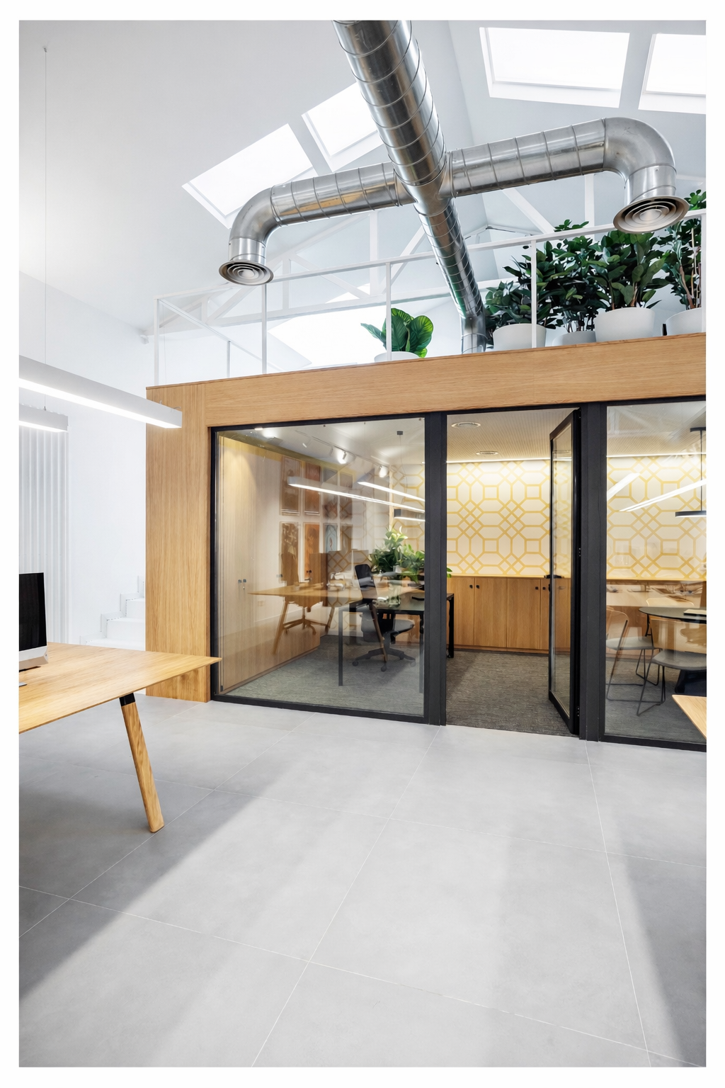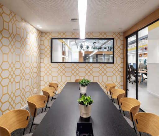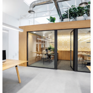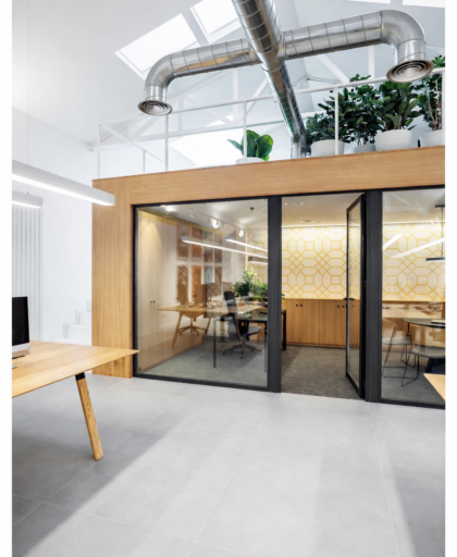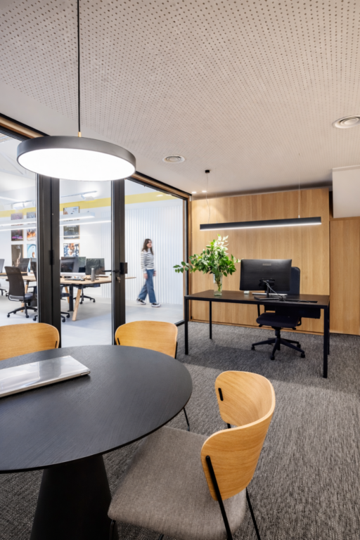 Los espacios más reservados —sala de reuniones y despacho de dirección— se diseñan como cubos exentos con cerramientos de vidrio. Esta solución permite mantener la privacidad sin perder continuidad visual ni conexión con el resto de la oficina.