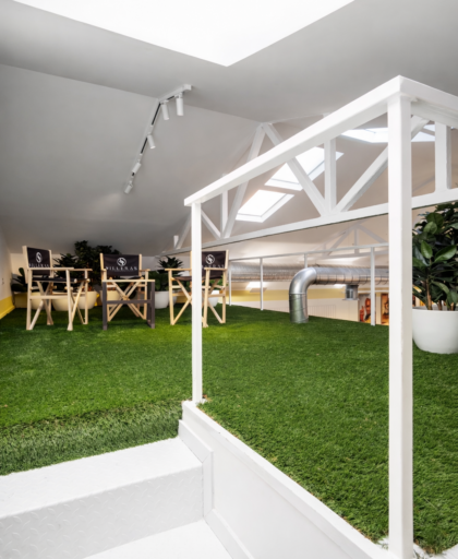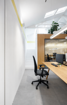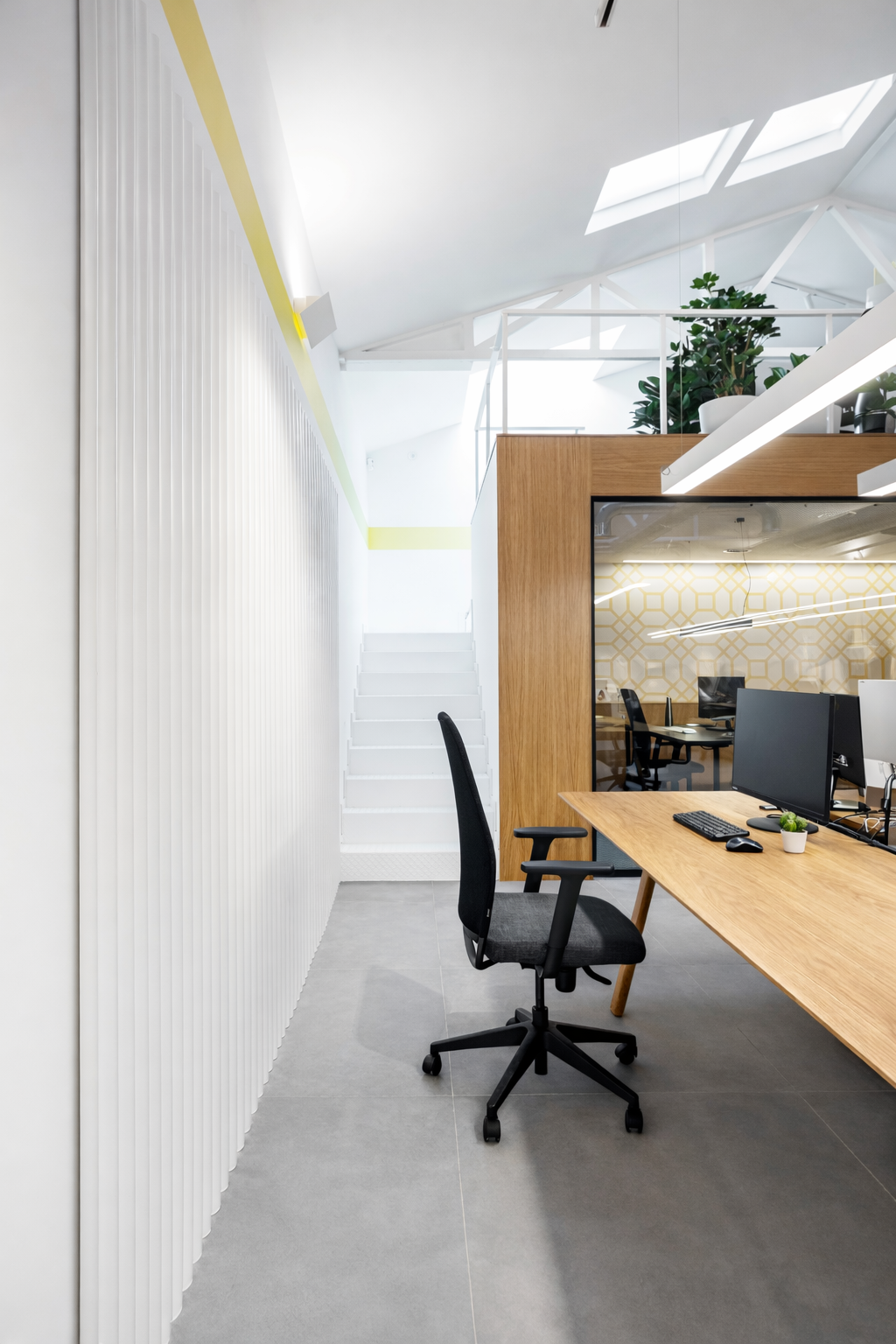 La intervención se apoya en las dos entradas de luz natural del local —fachada y lucernarios— para organizar la distribución y potenciar la sensación de amplitud. La altura de hasta cinco metros en la zona central permite crear un espacio de trabajo abierto, claro y dinámico que favorece la relación entre los equipos.